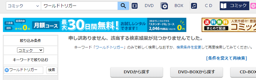 管理人が調べた時、以下のようにワールドトリガーのレンタルがやっていませんでした。